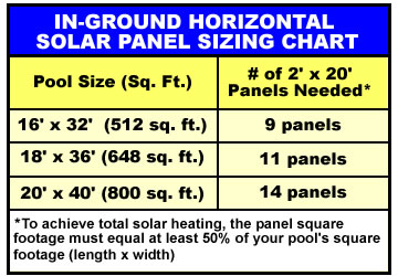 The economy SunGrabber™ is comprised of a base package with four 2'x20' (80 sq. ft.) panels and all related hardware. Additional panels can be added to the system to achieve optimal coverage. For total solar heating, the solar panel square footage should be equal to 50% of the pool's surface area.