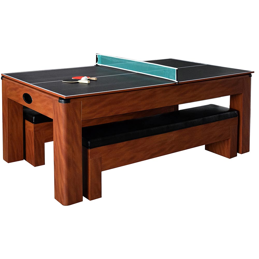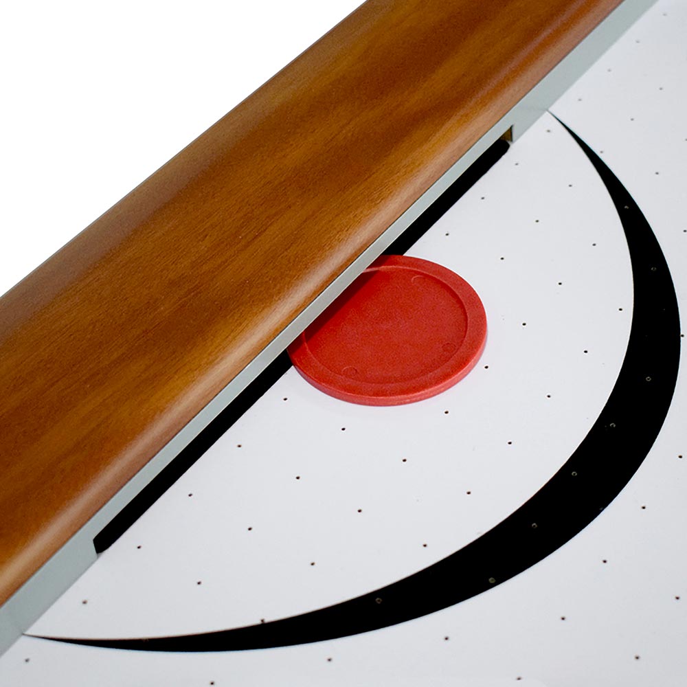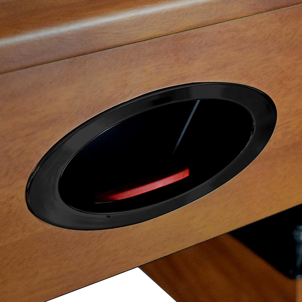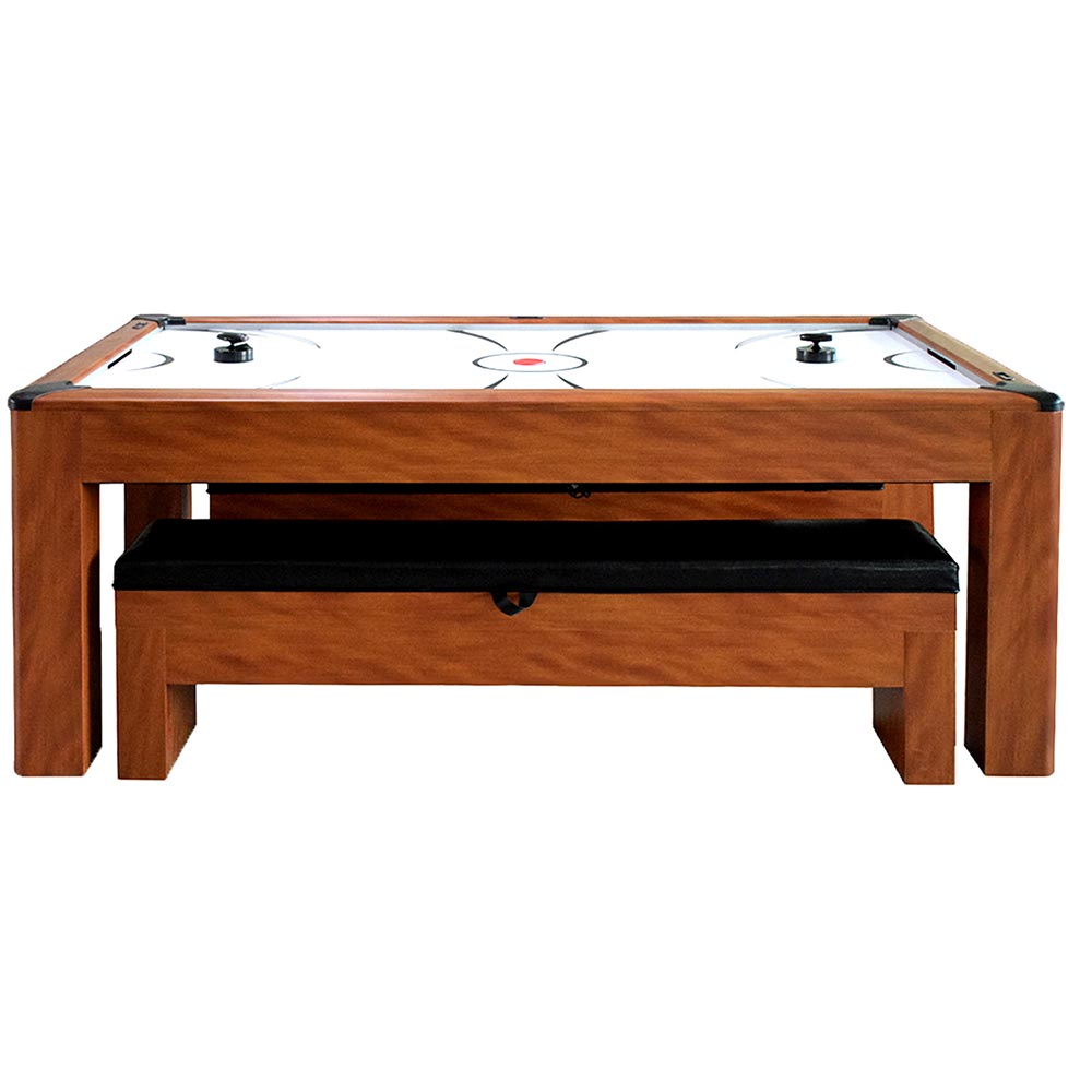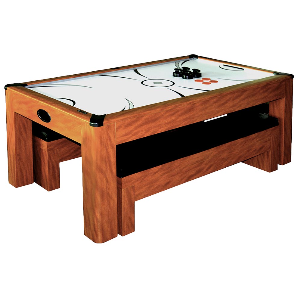 The handsome, multi-functional Sherwood Air Hockey Table is crafted from sturdy CARB certified MDF material featuring clean design lines covered in a beautiful light Cherry melamine that showcases the rich grain of cherry wood. With its unique, in-rail, electronic scoring display, the Sherwood easily converts from a dining or craft table to a full blown competitive table tennis or air hockey table. No raised scoring unit to get in the way! The super-slick play surface and competition air blower system deliver accurate air hockey table play. The Sherwood is designed and built to withstand vigorous table play. Includes matching benches with built-in storage and soft padded seat cushions that provide comfortable, convenient seating while keeping your game accessories close to the table and organized. 180-day limited warranty.