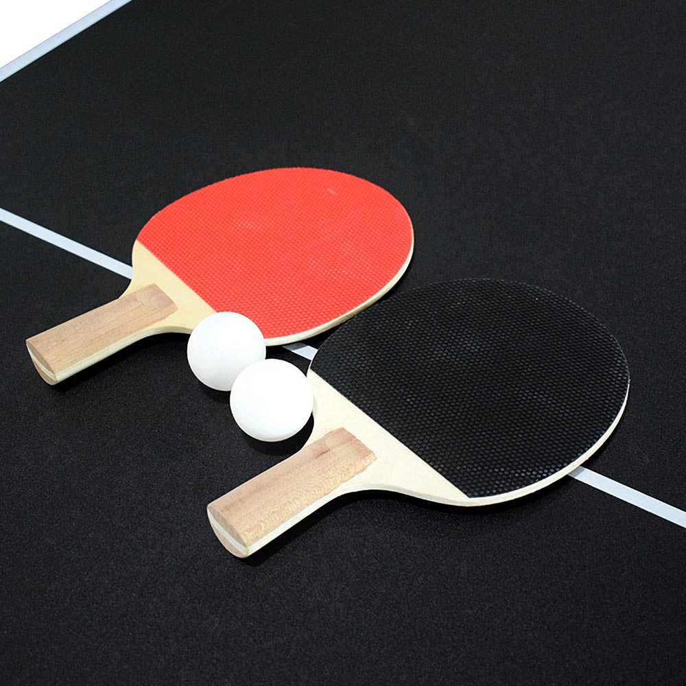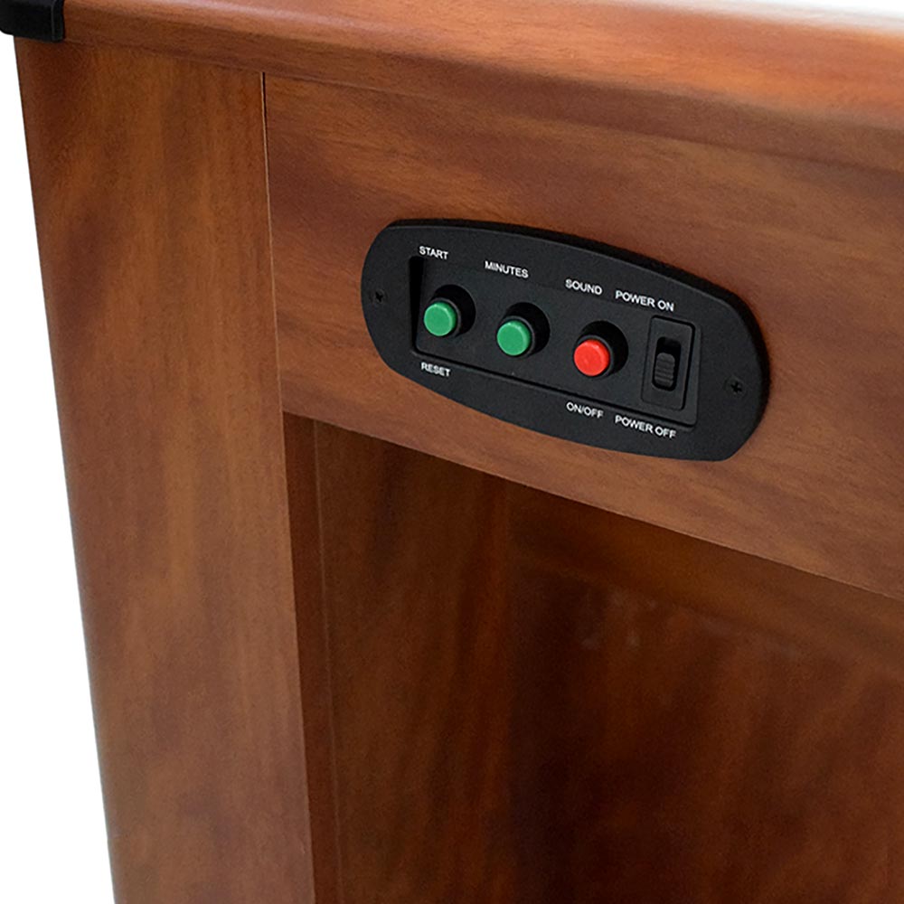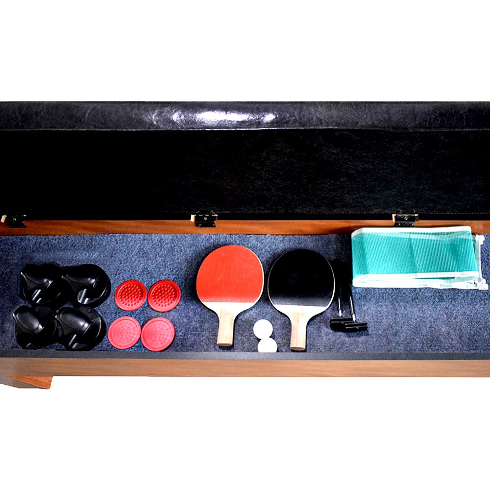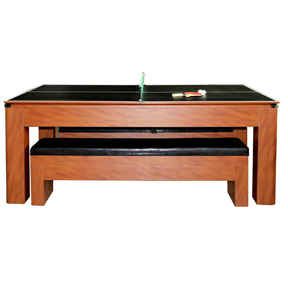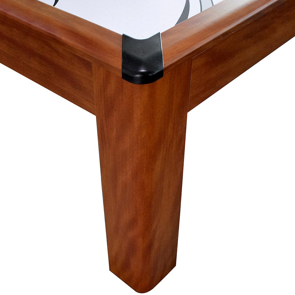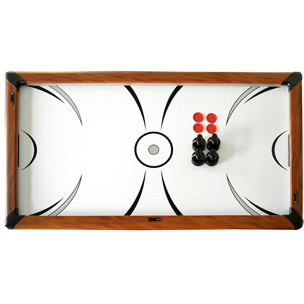 The handsome, multi-functional Sherwood Air Hockey Table is crafted from sturdy CARB certified MDF material featuring clean design lines covered in a beautiful light Cherry melamine that showcases the rich grain of cherry wood. With its unique, in-rail, electronic scoring display, the Sherwood easily converts from a dining or craft table to a full blown competitive table tennis or air hockey table. No raised scoring unit to get in the way! The super-slick play surface and competition air blower system deliver accurate air hockey table play. The Sherwood is designed and built to withstand vigorous table play. Includes matching benches with built-in storage and soft padded seat cushions that provide comfortable, convenient seating while keeping your game accessories close to the table and organized. 180-day limited warranty.
