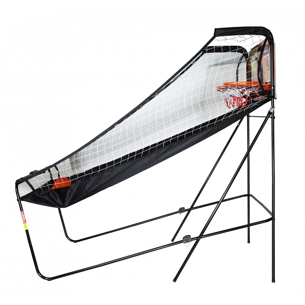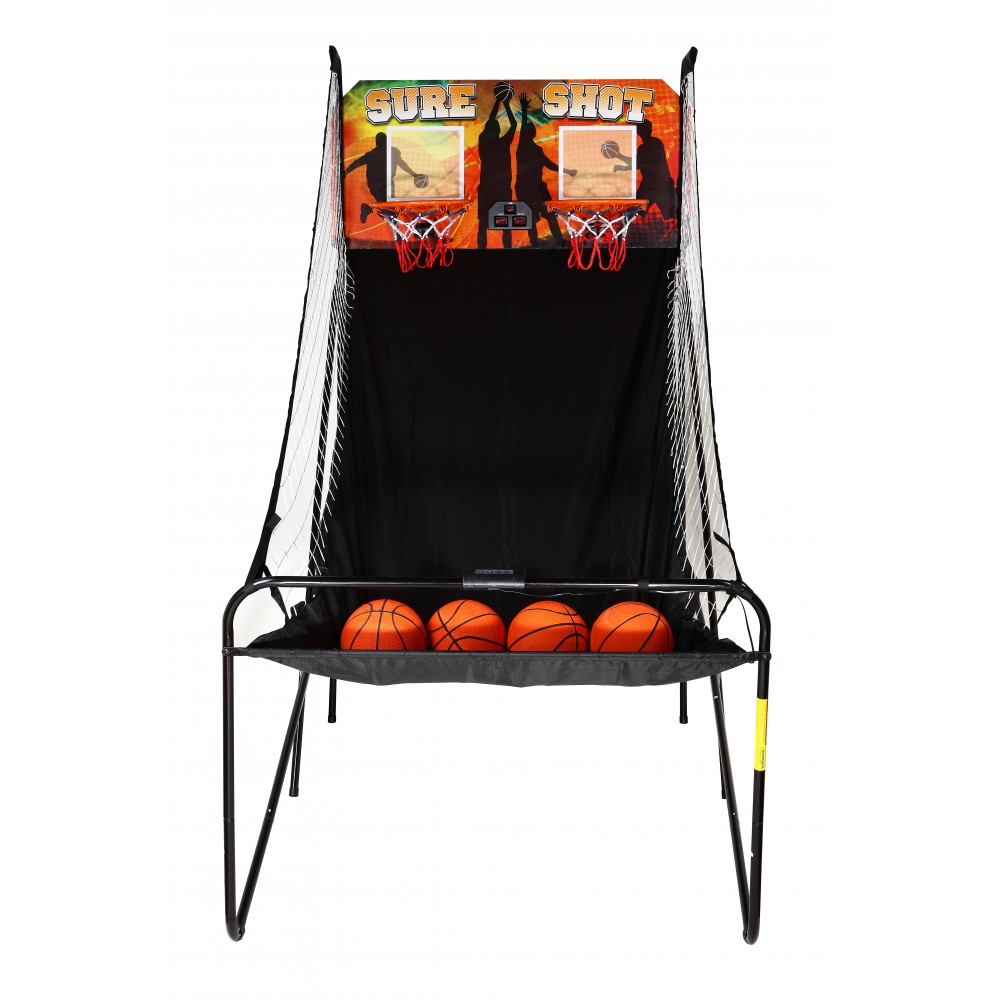 All the thrills and excitement of an arcade basketball game, designed for the home!. You get eight exciting game options and set up for one or two players. LED electronic scoring with built in time clock and sound keeps track of the score to keep the game moving rapidly. Rugged steel tubing frame provides stability and sturdiness. Folds for easy storage when not in use. Includes four basketballs, inflation pump and needle.