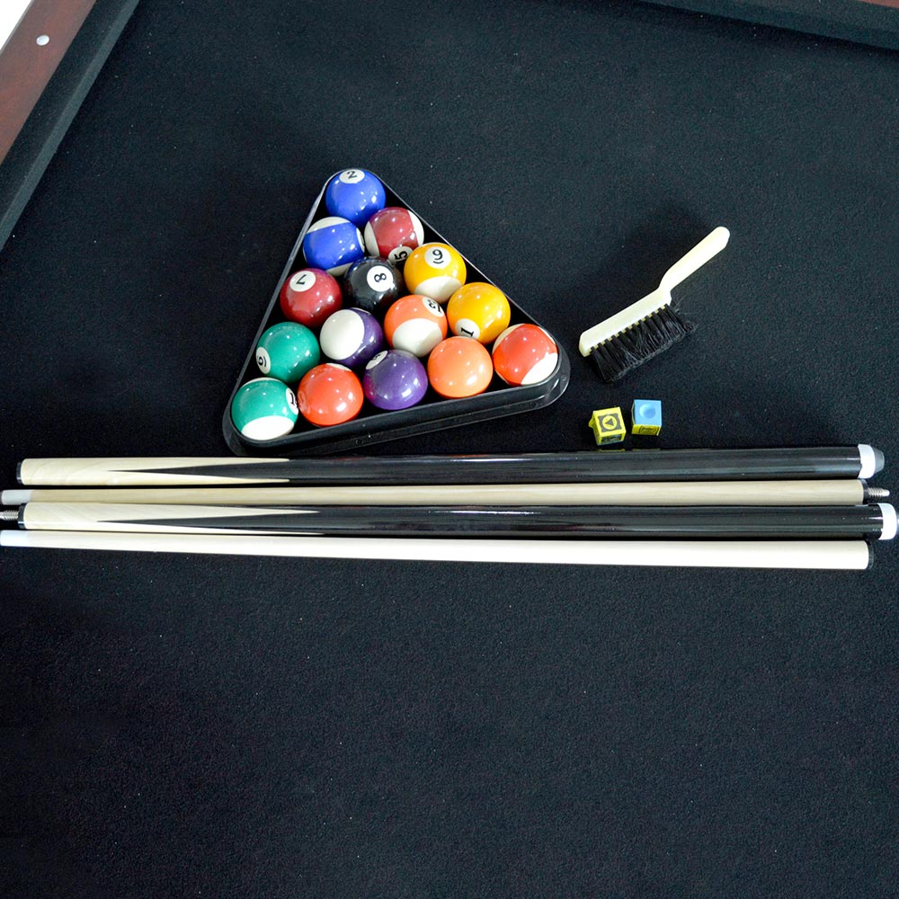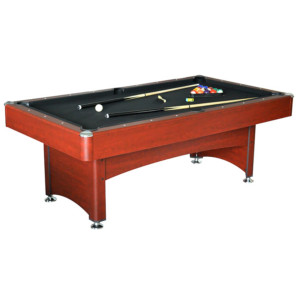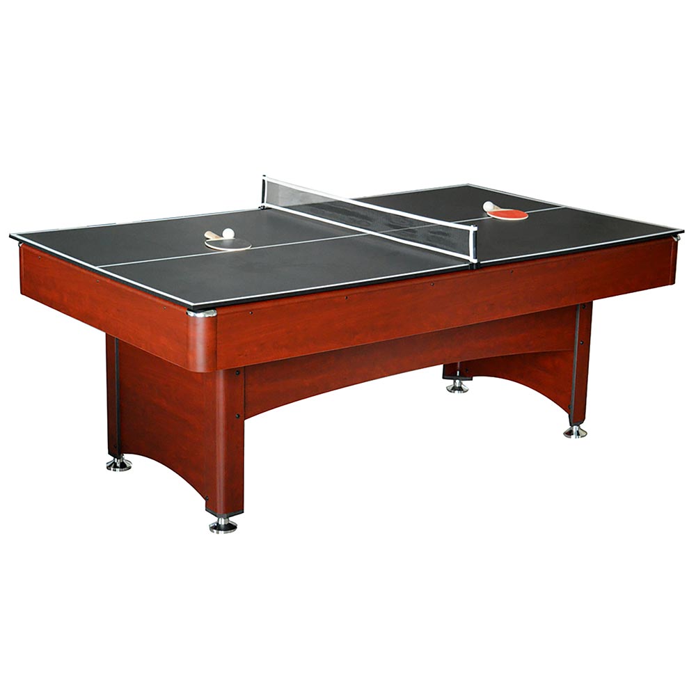 The Bristol 7 ft. Pool Table has the perfect combination of quality features and a compact size to easily fit in any room. The combination of the dark cherry melamine cabinet finish and chrome-plated corner caps instantly creates a stylish addition to any game room. Durable black plastic molded drop pockets and EVA rubber cushions for accurate and fast ball rebound round out the great features on this billiard table. The included quick change over table tennis top adds another dimension of competitive fun within the same space. This set includes all the accessories you need to play pool and table tennis. Certain to provide hours of competitive gaming fun for you, your friends and family! 180-day limited warranty.