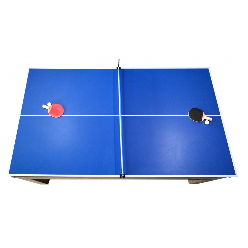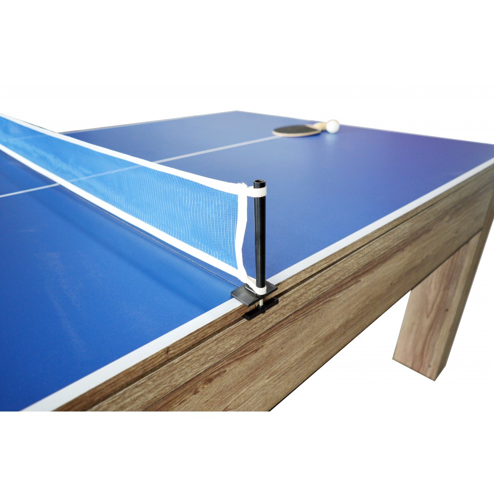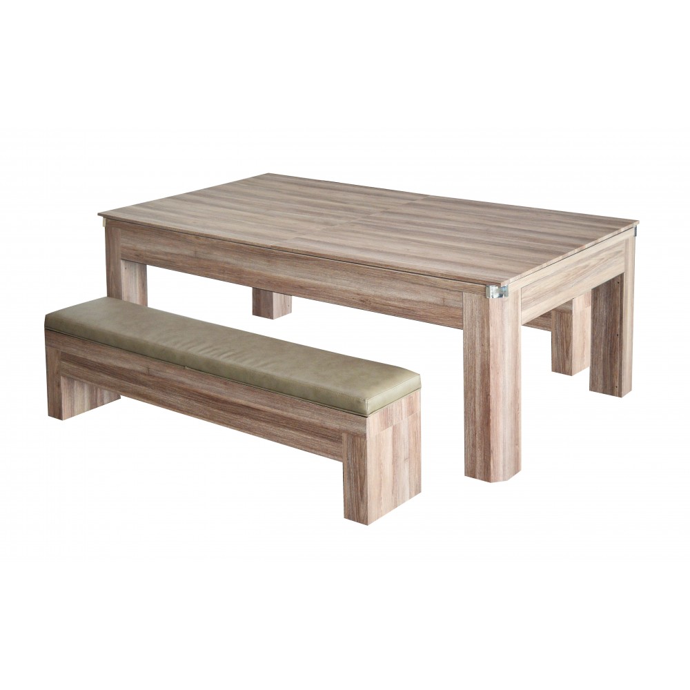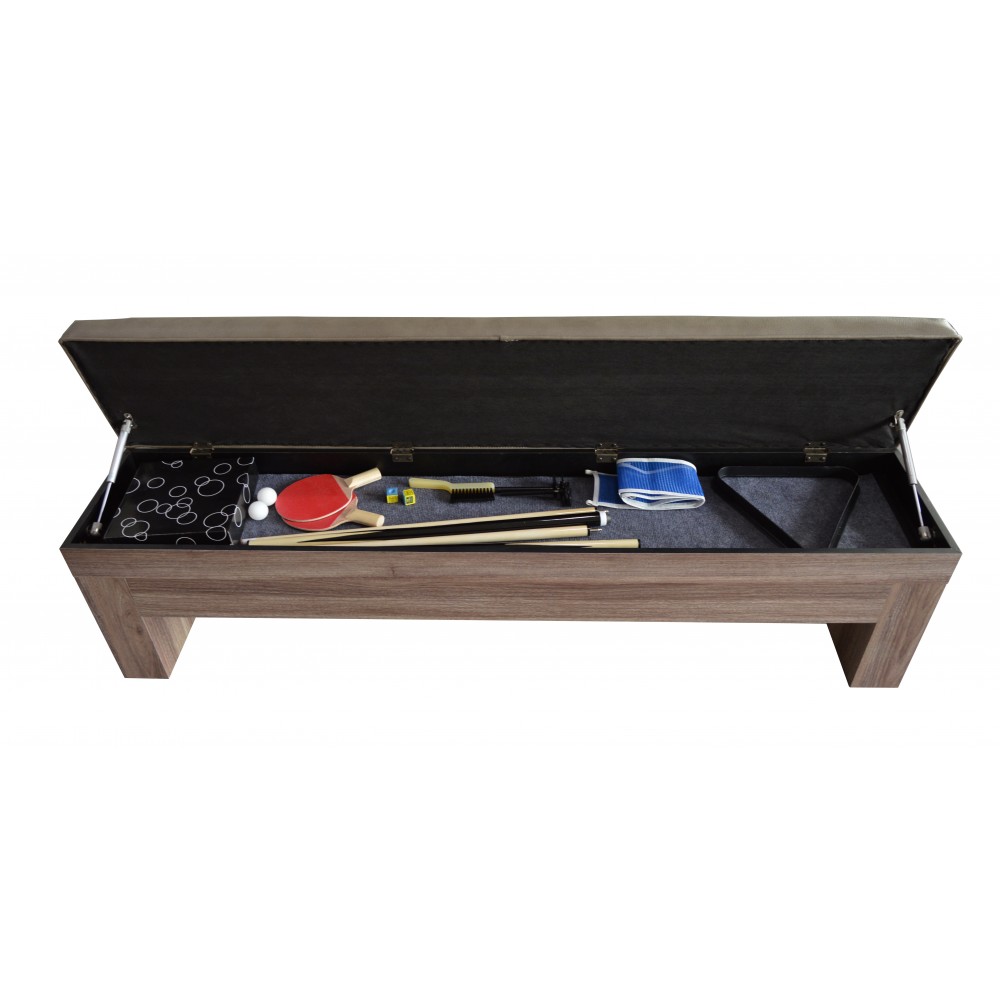 The handsomely, multi-function Newport pool table is crafted from sturdy CARB certified MDF material featuring crisp contemporary design lines covered in a beautiful driftwood melamine that showcases the rich grain and natural imperfections of reclaimed wood. The table can easily be converted from a dining or a craft table to a full blown competitive table tennis or pool table. Featuring 1/2 inch round inlayed sights, tournament tested "True Roll" bumpers, quality nylon wool blended cloth and chrome-plated corner caps. Includes matching benches with built in storage and soft padded seat cushions that provide comfortable convenient seating while keeping your game accessories close to the table and organized. A perfect solution for large family gatherings, parties or conference meetings! 180 Day Limited Warranty.