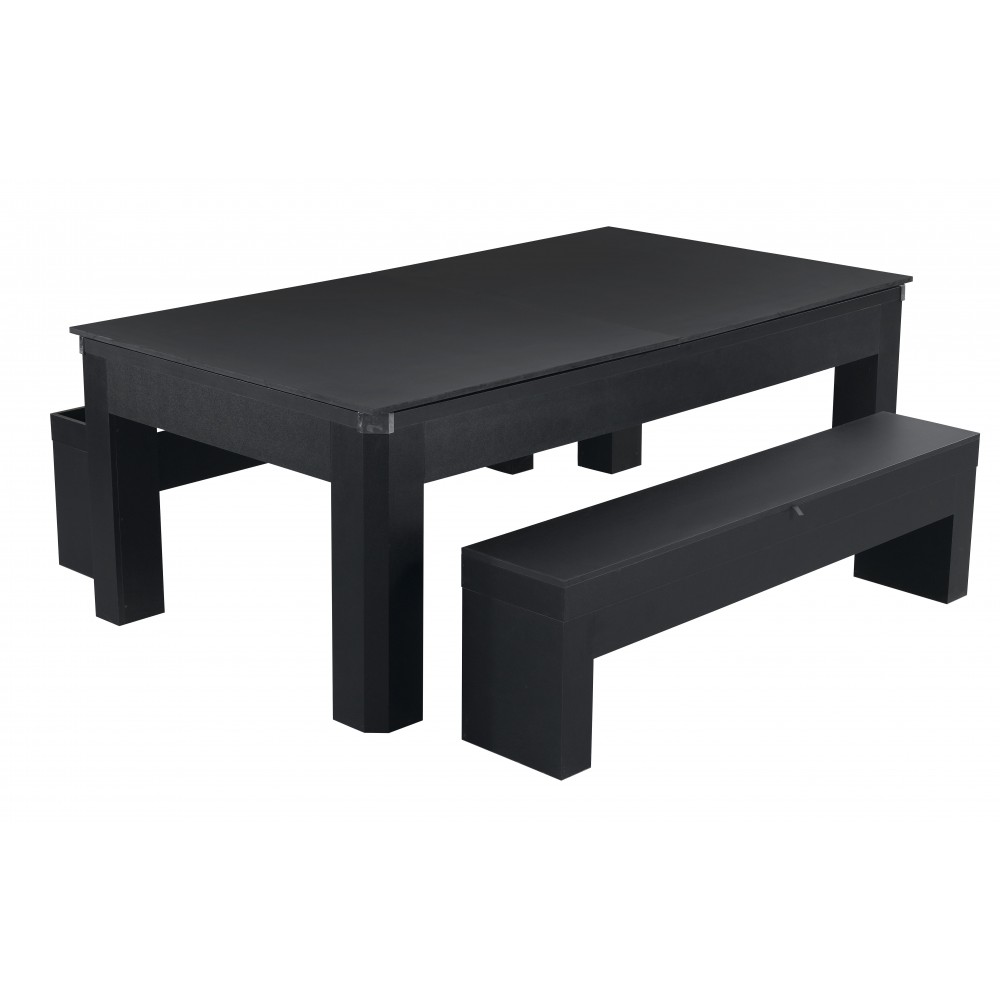 The Park Avenue billiards table captivates with quiet power and simple styling, but don't let the compact design or clean lines of this handsome pool table fool you. Within seconds the table is easily converted from a dining or craft table to a full blown competitive table tennis or pool table. Crafted from sturdy certified .75 inch MDF material covered in a durable black laminate, featuring .5 inch round inlayed sights, tournament tested True Roll bumpers, quality nylon wool blended cloth and chrome plated corner caps. The Park Avenue is guaranteed to provide hours of family fun and excitement. Matching benches with built in storage complete the set and keep your game accessories close to the table and organized while providing convenient seating.