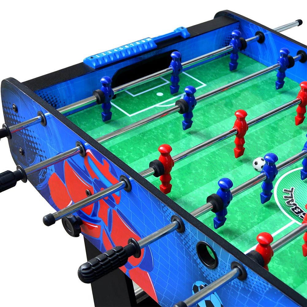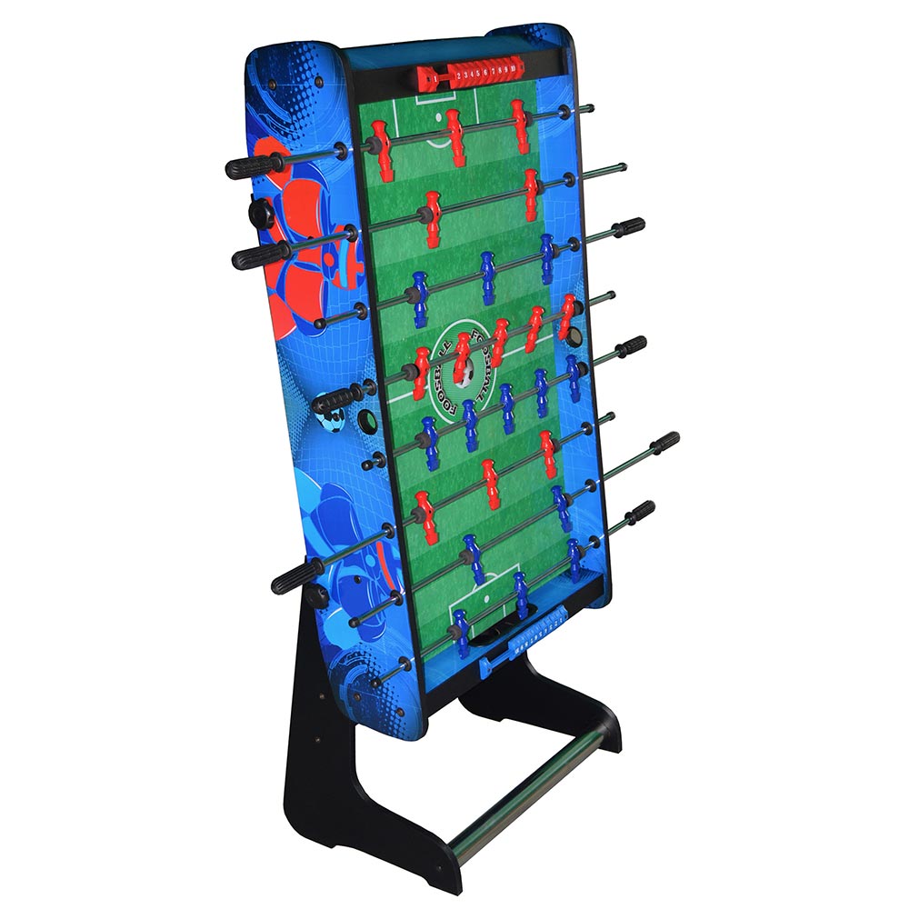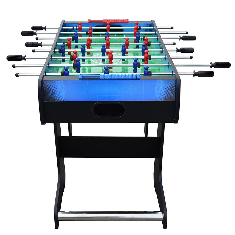 Built for players of all ages and skill levels, the Gladiator Folding Foosball table is constructed from rugged CARB certified environmentally safe materials. It features a unique folding leg designed for quick, easy, compact storage. This table is packed with quality features including easy-glide, fast-action play surface, dual manual ABS slide scoring system, goal boxes with built-in automatic end ball return, 1/2 inch chrome plated tubular steel rods, ergonomic handles and ABS molded durable players. This combination of quality features delivers improved game speed while reducing wrist stress. Vibrant, colorful exterior action graphics add the finishing touch to this dynamic table! 180-day limited warranty.