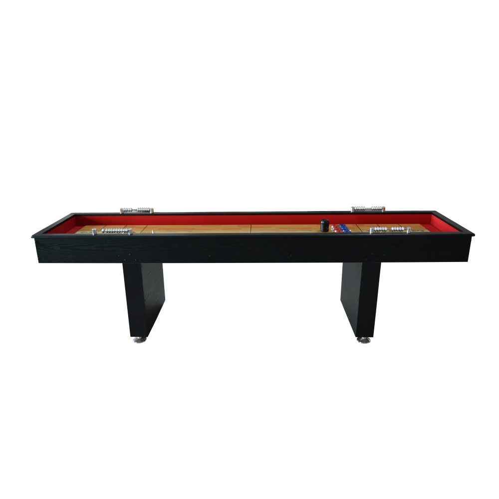 The Avenger is the perfect table to introduce the exciting and fun game of shuffleboard to your family and friends, right in the comfort of your own home. The beautiful black melamine cabinet and sturdy pedestal legs with adjustable leg levelers provide optimum stability and level play. Features a super slick poly coated playing surface for smooth sliding action and padded gutters that reduce noise during play. Crafted from durable CARB certified MDF. Accessories include: 4 blue pucks, 4 red pucks, 2 ABS abacus scoring units, 1 table brush and 1 can of table wax. 180 Day Limited Warranty.
