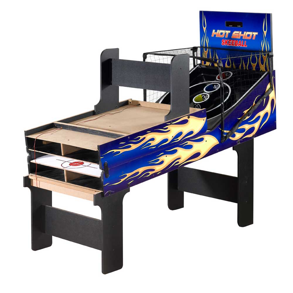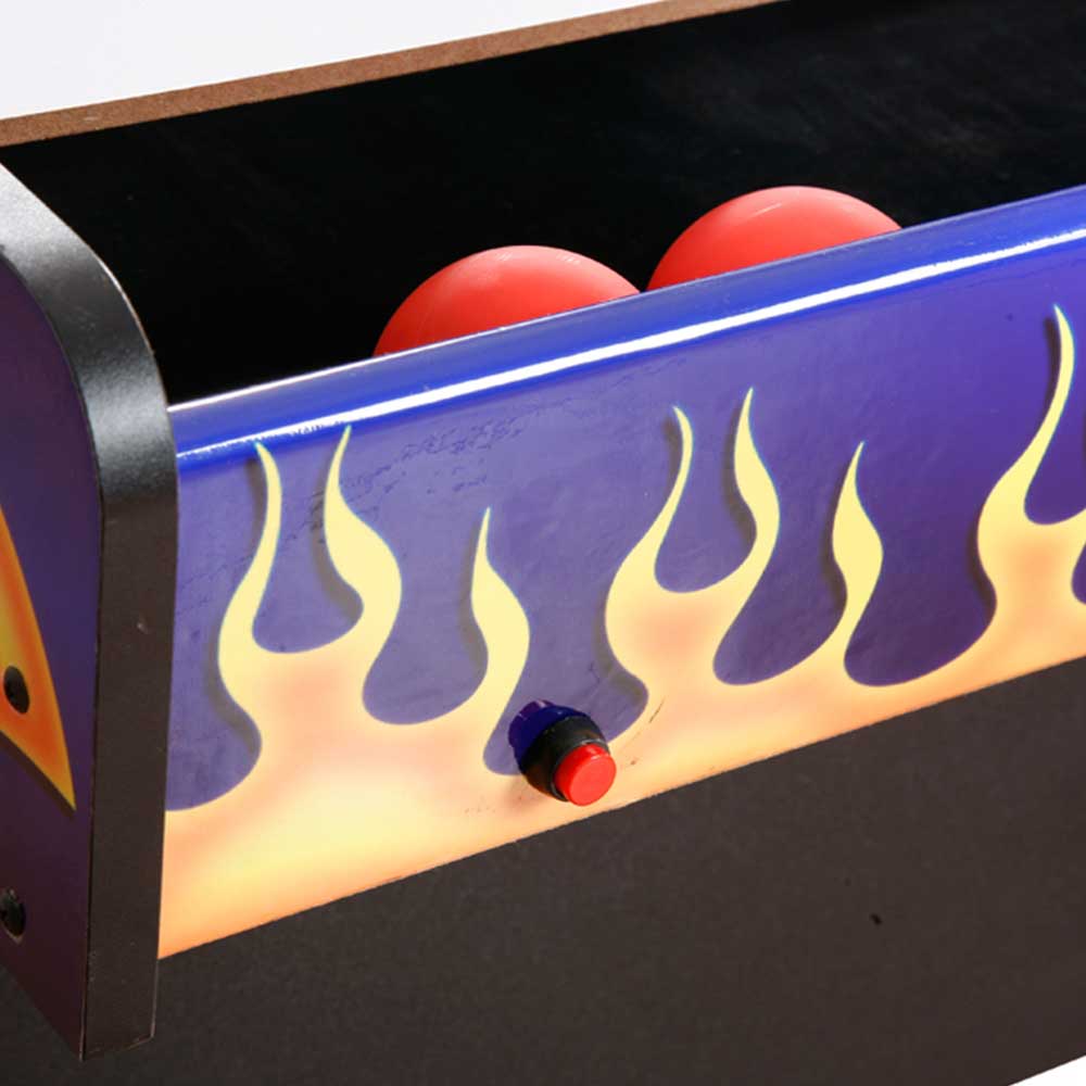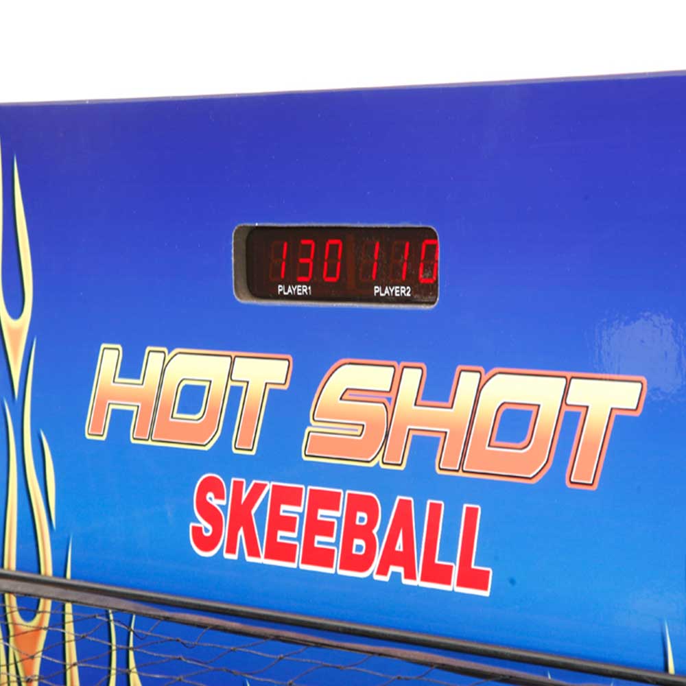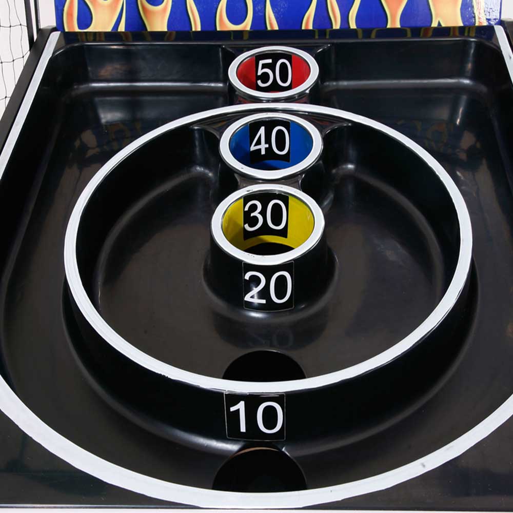 The Hot Shot Skeeball Table is crafted from CARB certified heavy duty MDF material designed to withstand the most vigorous table play. The bright table colors and action graphics add to the excitement of the game. Durable ABS molded catch rings and an authentic arcade style playing surface with target guides keep you looking for the winning zone all night long. The electronic scorer keeps a running tab on who's winning, heightening the level of competition. A safety net encloses the target board to keep balls in play while protecting spectators and furniture from the occasional miss roll! The Hot Shot is a breeze to move with its fold-up frame and easy re-assembly. A classic Skeeball Arcade game that will bring back old memories while creating hours of new fun and enjoyment!